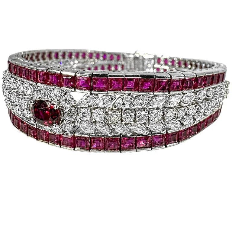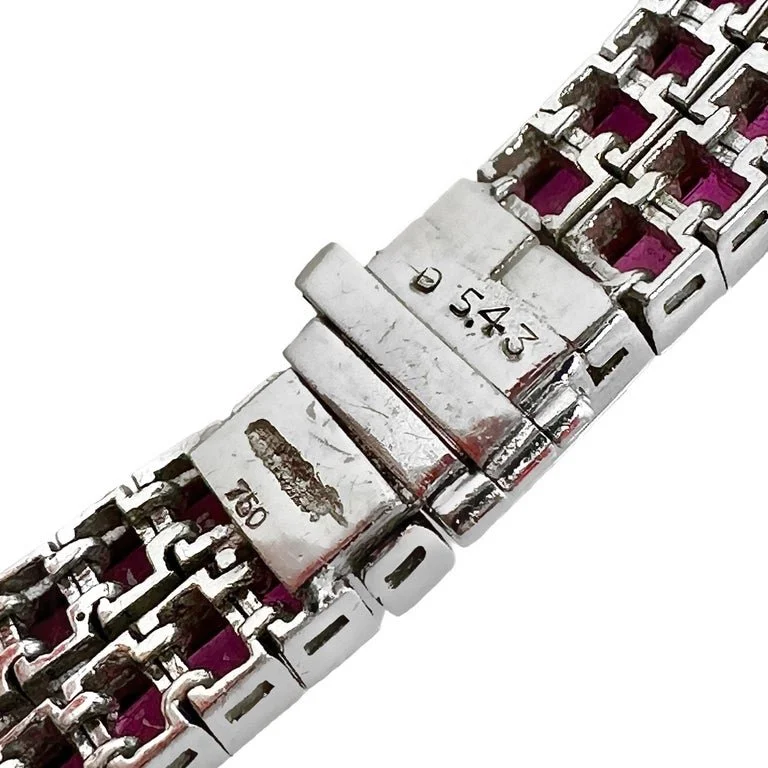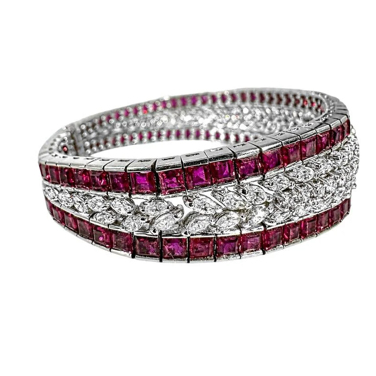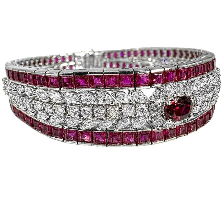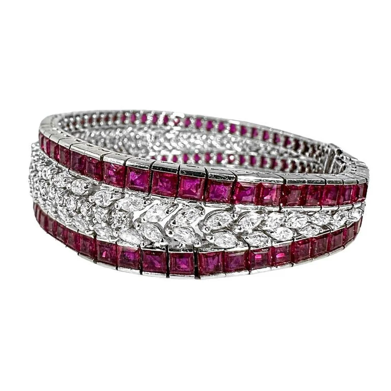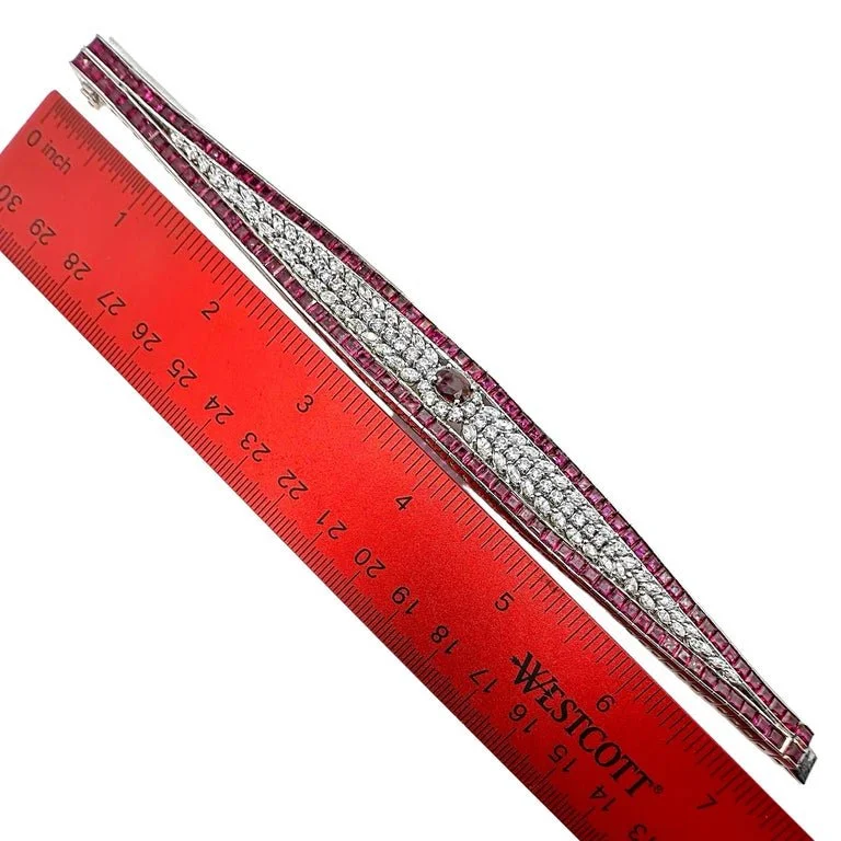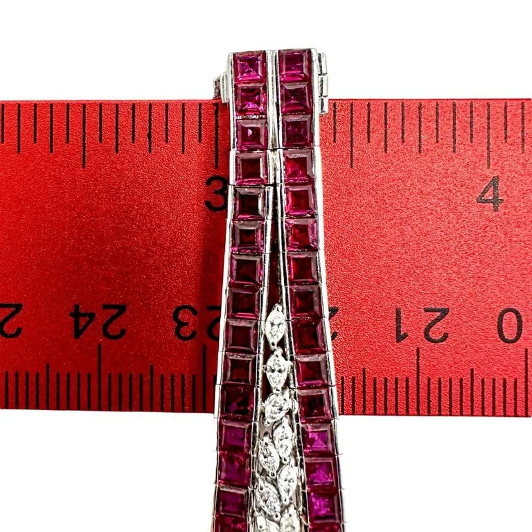 A stunning 18K white gold bracelet borrowing design cues from Art-Deco and Mid-Century cocktail designs. This elegant looking bracelet is centered around a ruby weighing approximately 1ct surrounded by round brilliant cut diamonds, and flanked by both round brilliant and marquise cut diamonds. This center section is additionally framed by square cut rubies in straight-line channel setting on the top and bottom of the bracelet. Total diamond weight is stamped inside the bracelet at 5.43ct and this weight has been confirmed by our gemologist. Diamonds are of overall G/H color and VS1-SI2 clarity. Each row of rubies weighs approximately 10ct for a total weight of approximately 20ct. This tailored looking piece tapers in width from 2/3 of an inch in the front down to 1/3 of an inch by the clasp. Measures 7 1/8 inches long. Gross weight 52.8 grams.