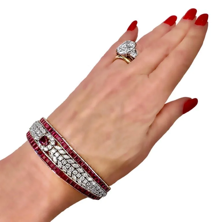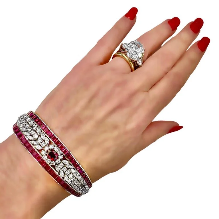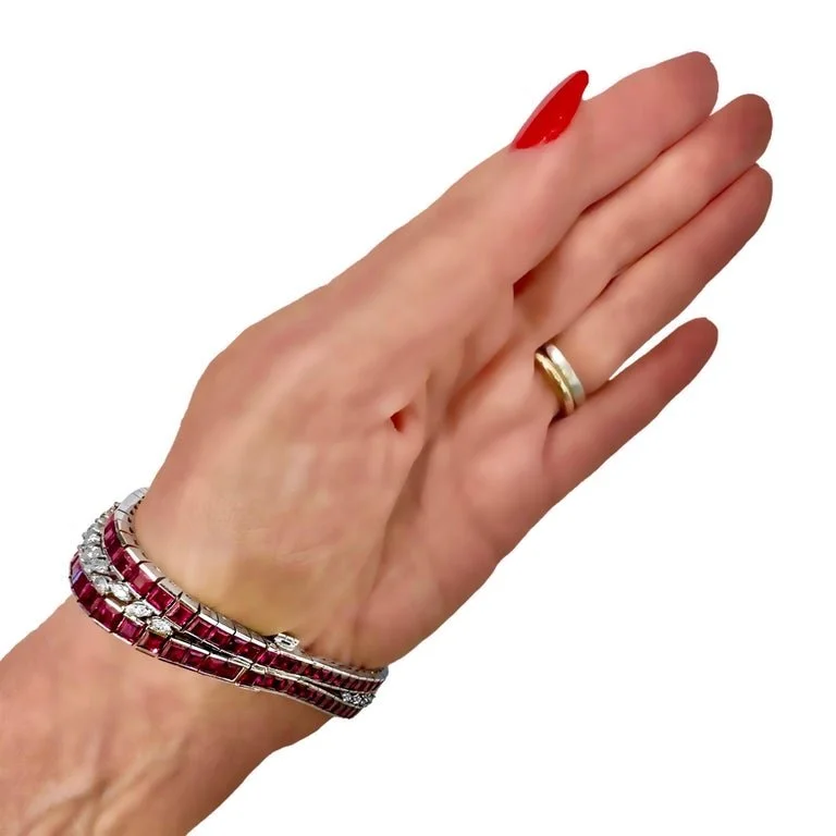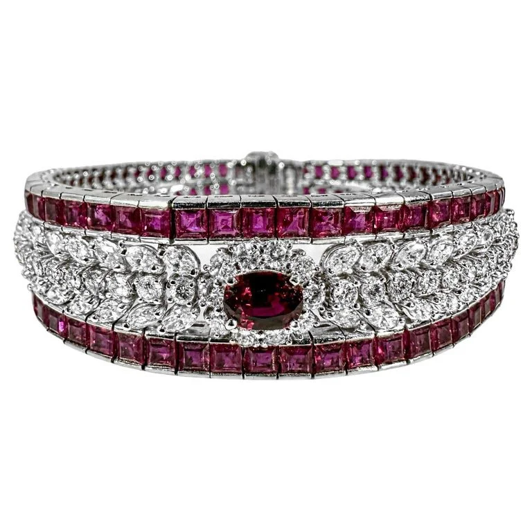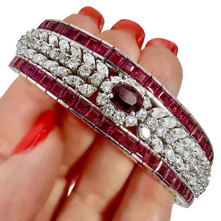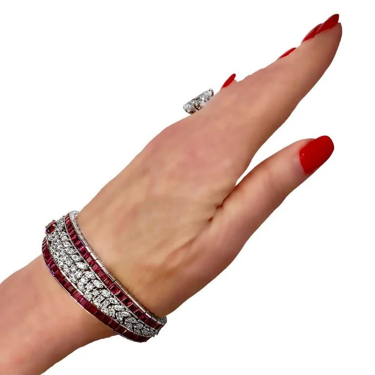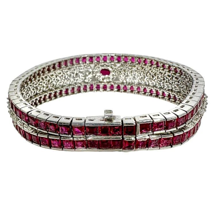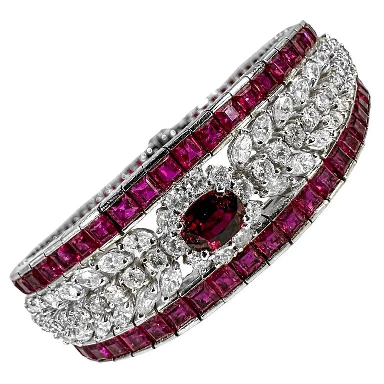 A stunning 18K white gold bracelet borrowing design cues from Art-Deco and Mid-Century cocktail designs. This elegant looking bracelet is centered around a ruby weighing approximately 1ct surrounded by round brilliant cut diamonds, and flanked by both round brilliant and marquise cut diamonds. This center section is additionally framed by square cut rubies in straight-line channel setting on the top and bottom of the bracelet. Total diamond weight is stamped inside the bracelet at 5.43ct and this weight has been confirmed by our gemologist. Diamonds are of overall G/H color and VS1-SI2 clarity. Each row of rubies weighs approximately 10ct for a total weight of approximately 20ct. This tailored looking piece tapers in width from 2/3 of an inch in the front down to 1/3 of an inch by the clasp. Measures 7 1/8 inches long. Gross weight 52.8 grams.