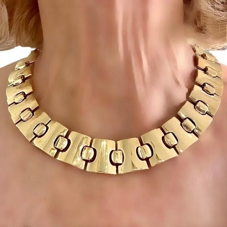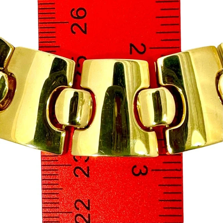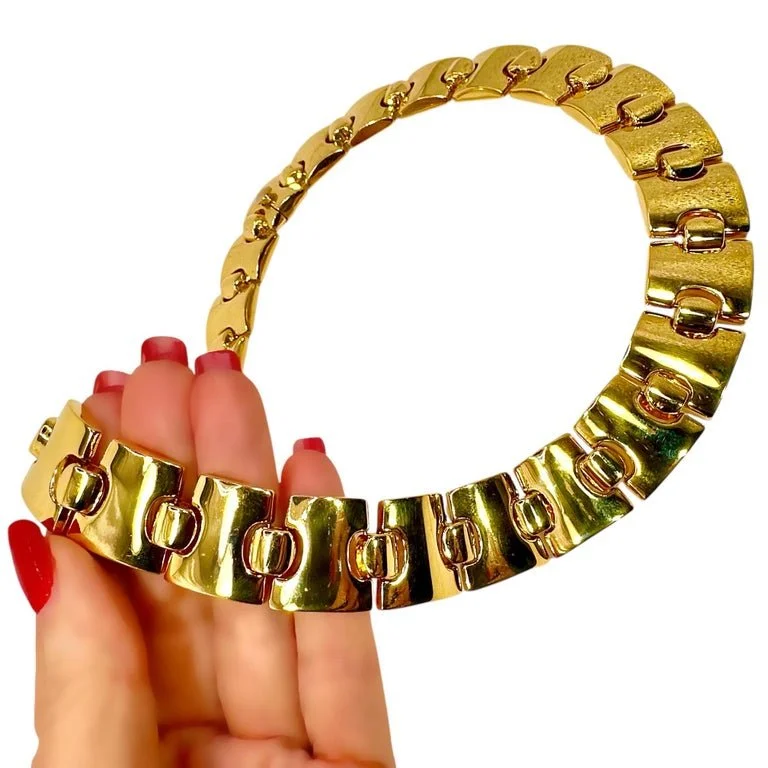 This outstanding 18K yellow gold 1970's choker necklace created by Italian designer KRIA is a visually powerful delight. Twenty five tapered bombe sections with cushion shaped connecting links create a high polished line of glistening beauty. This necklace, like many Italian gold jewels, consists of heavy gauge 18K yellow gold links with hollow centers. By expertly crafting items in this fashion, very durable jewelry is created. Without being able to employ this method of fabrication, this tailored choker would be extremely heavy and uncomfortable to wear, in addition to being extremely costly. The necklace measures 16 inches long by just over 3/4 of an inch wide. A very secure in line clasp assures worry free wear. A white gold plate engraved with the designer's name is applied to the reverse side of the clasp in addition to the stamp 750 (for 18K gold) and the Italian shop mark on the plunger. Gross weight 108.5 grams.